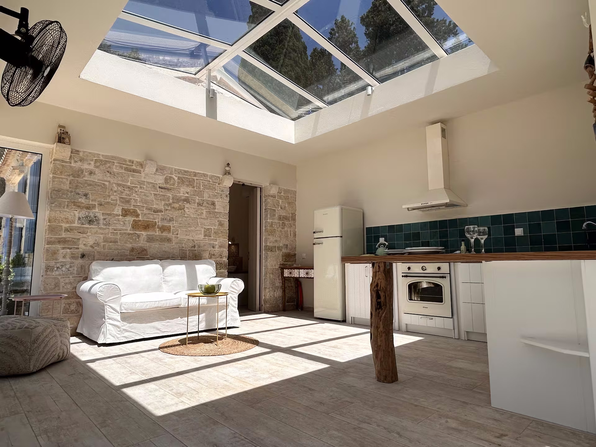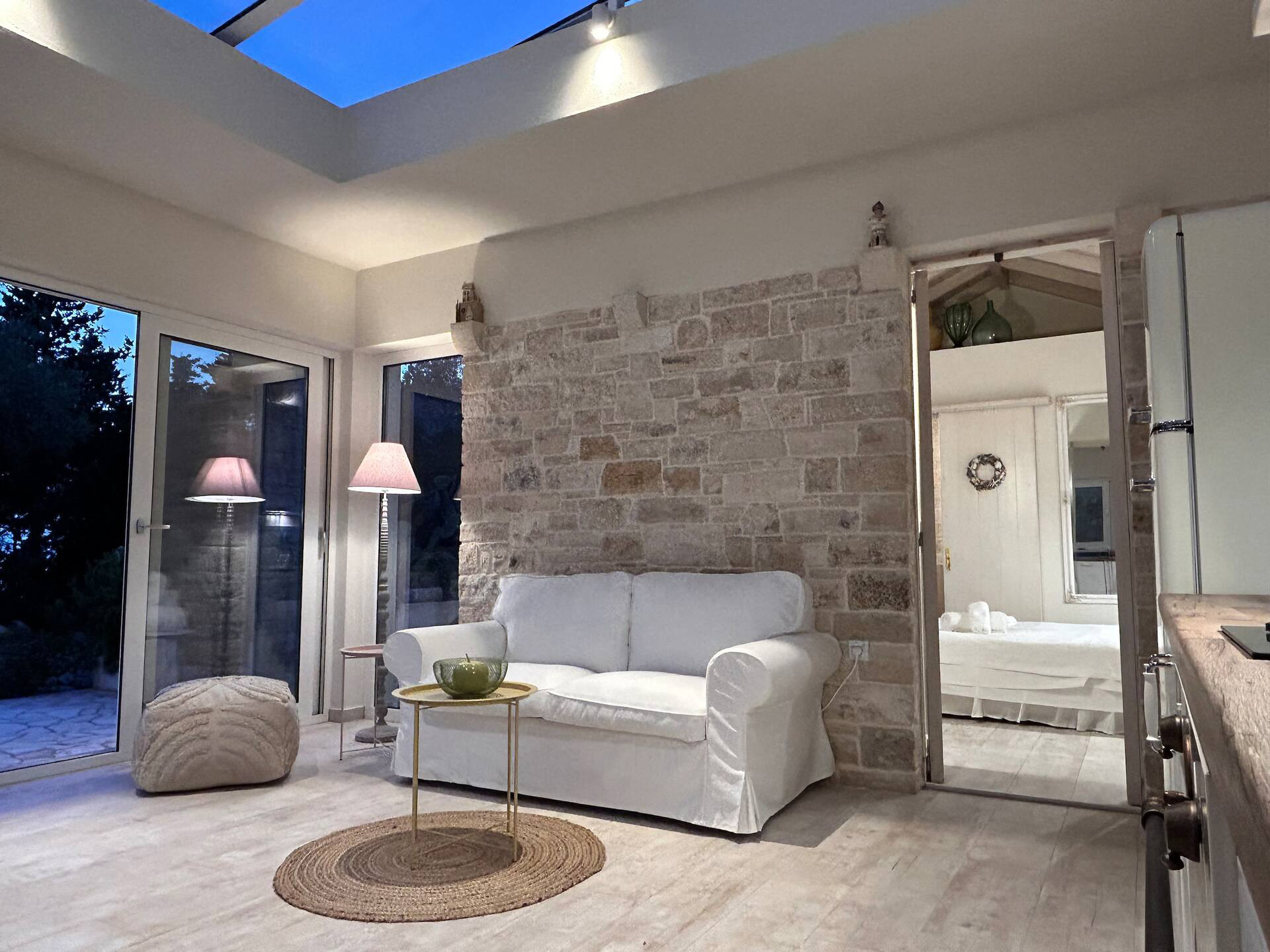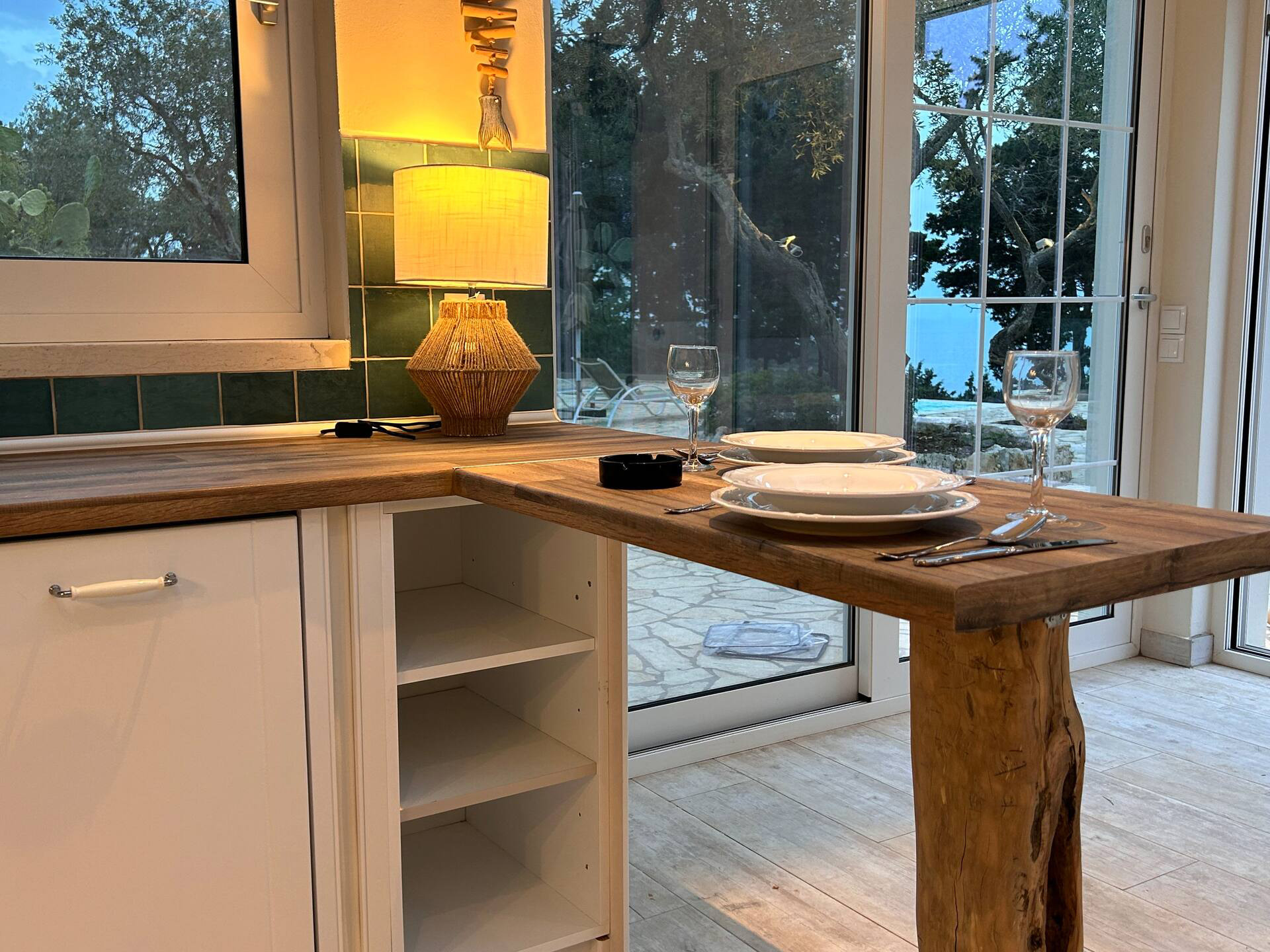 The villa’s open-plan layout extends to a shaded outdoor living area, where you can dine, work, or unwind — always with a view of the sea and the olive trees around you.